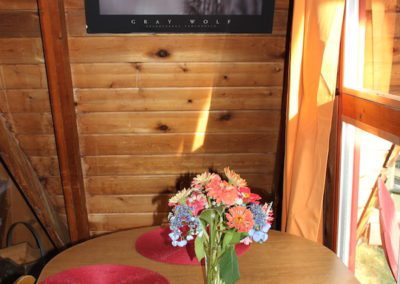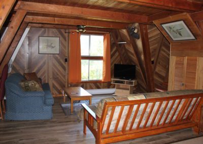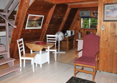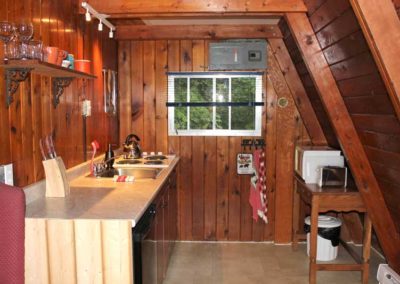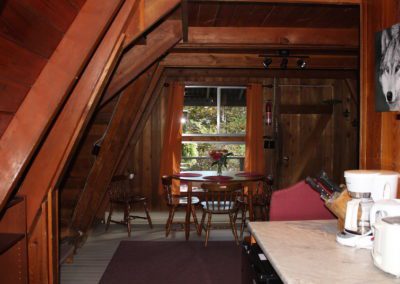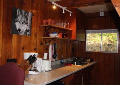 The cozy Wolf Chalet is an open concept kitchen/living room with washroom (shower only.)